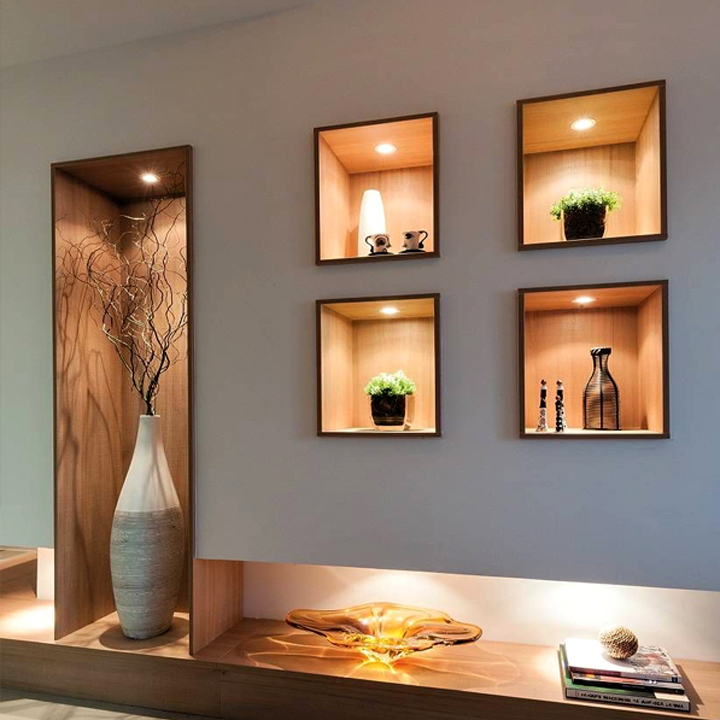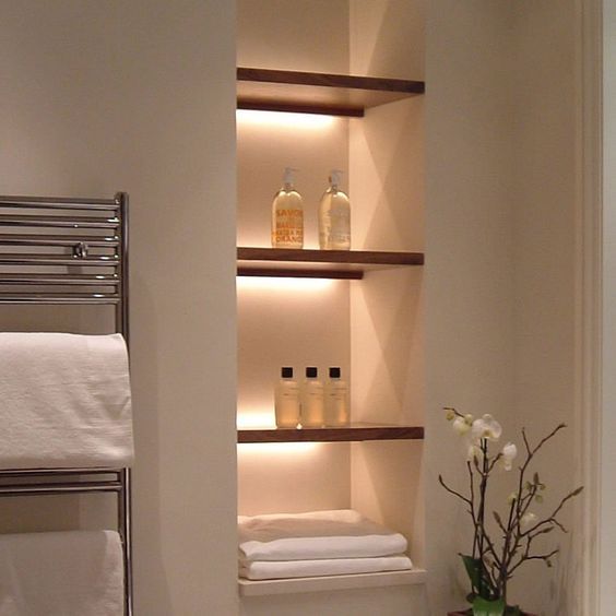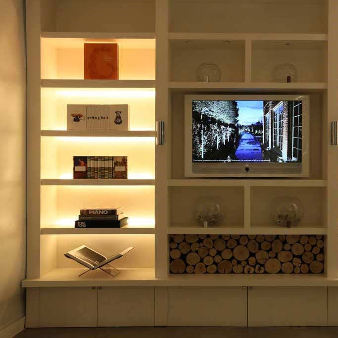 Ας δούμε τις καλύτερες επιλογές φωτισμού ραφιών LED. Στη φωτογραφία απεικονίζονται τρεις διαφορετικές εφαρμογές φωτισμού. Για να γίνει αυτό, έχουν χρησιμοποιηθεί τρείς διαφορετικές κατασκευαστικές λεπτομέρειες, οι οποίες έχουν καθορίσει και τον τρόπο με τον οποίο φωτίζεται το κάθε ράφι.